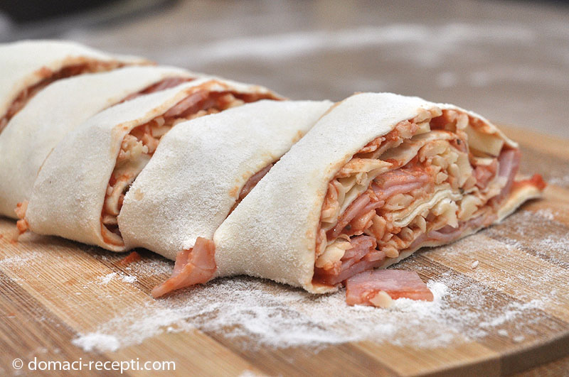 Razvaljamo jedno lisnato tijesto.Na kockice narežemo 15 dkg šunke za Pizzu i naribamo 15 dkg topljenog sira.Lisnato tijesto premažemo koncentratom rajčice, kojega smo razrijedili sa vodom.Posipamo origano i nadjenemo prvo kockicama šunke, zatim sirom.Zarolamo u roladu i režemo Pizzete širine 2 cm.Poslažemo na lim (na koji smo stavili papir za pečenje) i pečemo na 200 stupnjeva 15-20 minuta.