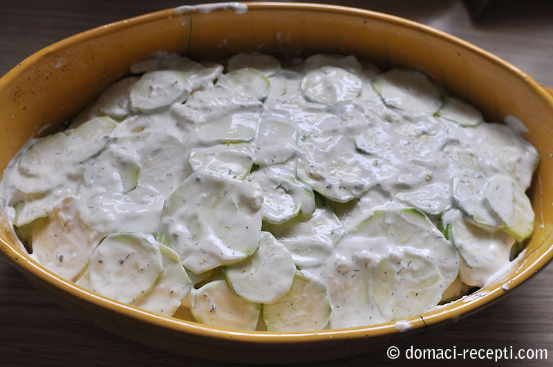 Vrijeme je mladog krumpira i finih mladih tikvica sa vrta. Obje namirnice fine su na mnogo načina. Krumpir kao prilog glavnom jelu, ali i kao vodeća namirnica u jelu. Tikvice možemo peći na roštilju, pohati ili ih naribati i raditi popečke. Danas smo ih spojili u složenac. Tikvice i krumpir smo narezali na tanke ploškice kako bi se lakše ispekli. Pekač smo namastili maslacem i slagali red krumpira, red tikvica, pa umak od kiselog vrhnja, češnjaka i kopra. Tikvice je dobro nasoliti odmah nakon rezanja kako bi pustile vodu prije nego ih položimo u složenac. Svaki red krumpira posolimo i popaprimo kad je složen. Ispalo je četiri reda krumpira i isto toliko tikvica. Pekli smo u pečnici na 200 stupnjeva oko sat vremena. Pred kraj na vrh smo poslagali malo domačeg špeka. Složenac je bio ručak i dovoljan bez priloga, a može mu se dodati još neko sezonsko povrće ili začin po volji.