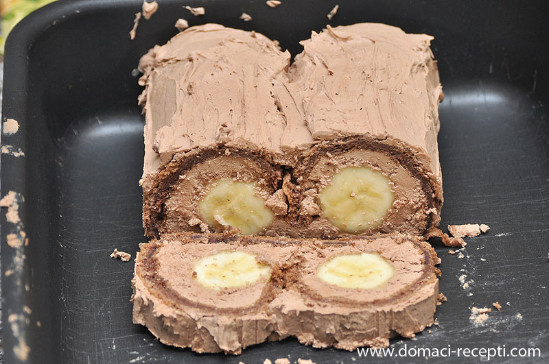 Bananama odrežemo krajeve i složimo jednu iza druge na jedan rub biskvita.