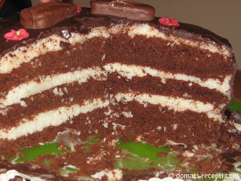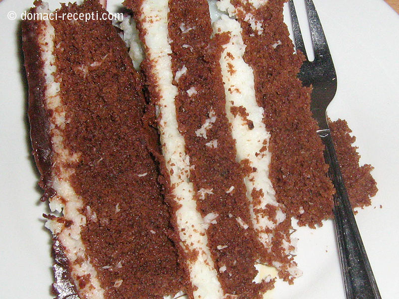 -čokoladu sa vodom otopiti na laganoj vatri i ostaviti da se hladi -izmiksati žutanjke i šečer -izmiksati posebno bjelanjke -u žutanjke i šečer dodati ulje,mlijeko,i čokoladu te još jednom kratko izmiksati -pomiješati brašno,prašak za puding,kakao i prašak za pecivo te sve to staviti u žutanjke te lagano promiješati kuhačom,te u to dodati snijeg od bjelanjaka -pola smjese izliti u kalup za pečenje(20X30) -nauljen i pobrašnjen -peći 10min na 180 -dok se biskvit peće napraviti nadjev od kokosa