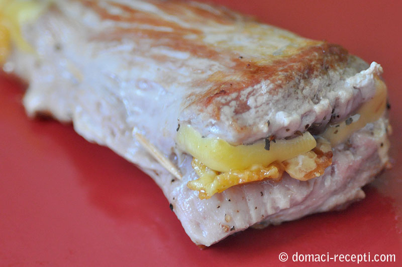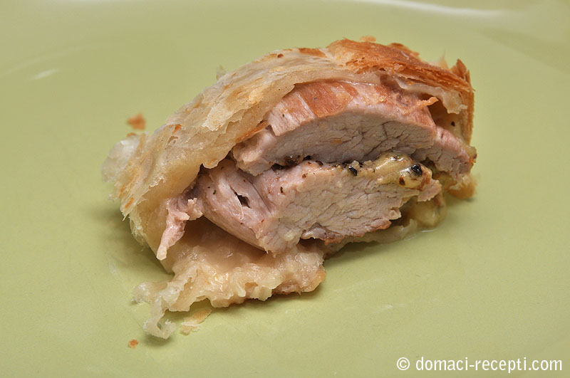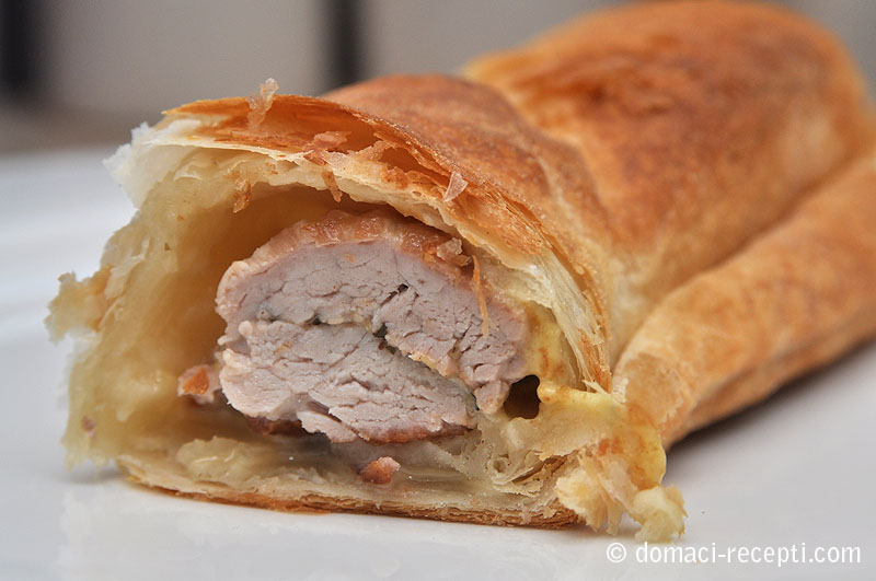Sa lungića skinemo masnije djelove i prerežemo ga po polovici, ali ne dokraja i istučemo kuhinjskim batom .Posolimo ga, popaprimo, pospemo bosiljkom i napunimo narezanim topljenim sirom.Preklopimo i učvrstimo čačkalicom.Kratko ga prepečemo na vrućem ulju sa obje strane, pa stavimo na par minuta na papirnati ručnik da se upije masnoća.Za to vrijeme razvaljamo lisnato tijesto i zagrijemo pećnicu na 200 stupnjeva.Lungić umotan u lisnato tijesto položimo na pobrašnjeni lim ili bolje na lim obložen papirom za pečenje.